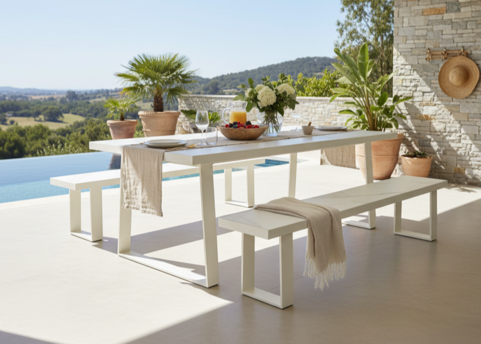 Discover the ultimate in outdoor dining luxury with our maintenance-free exterior dining tables, crafted using robust New Zealand steel and topped with premium Italian porcelain. This table is built for durability and elegance, standing strong against the elements for a lifetime of use.