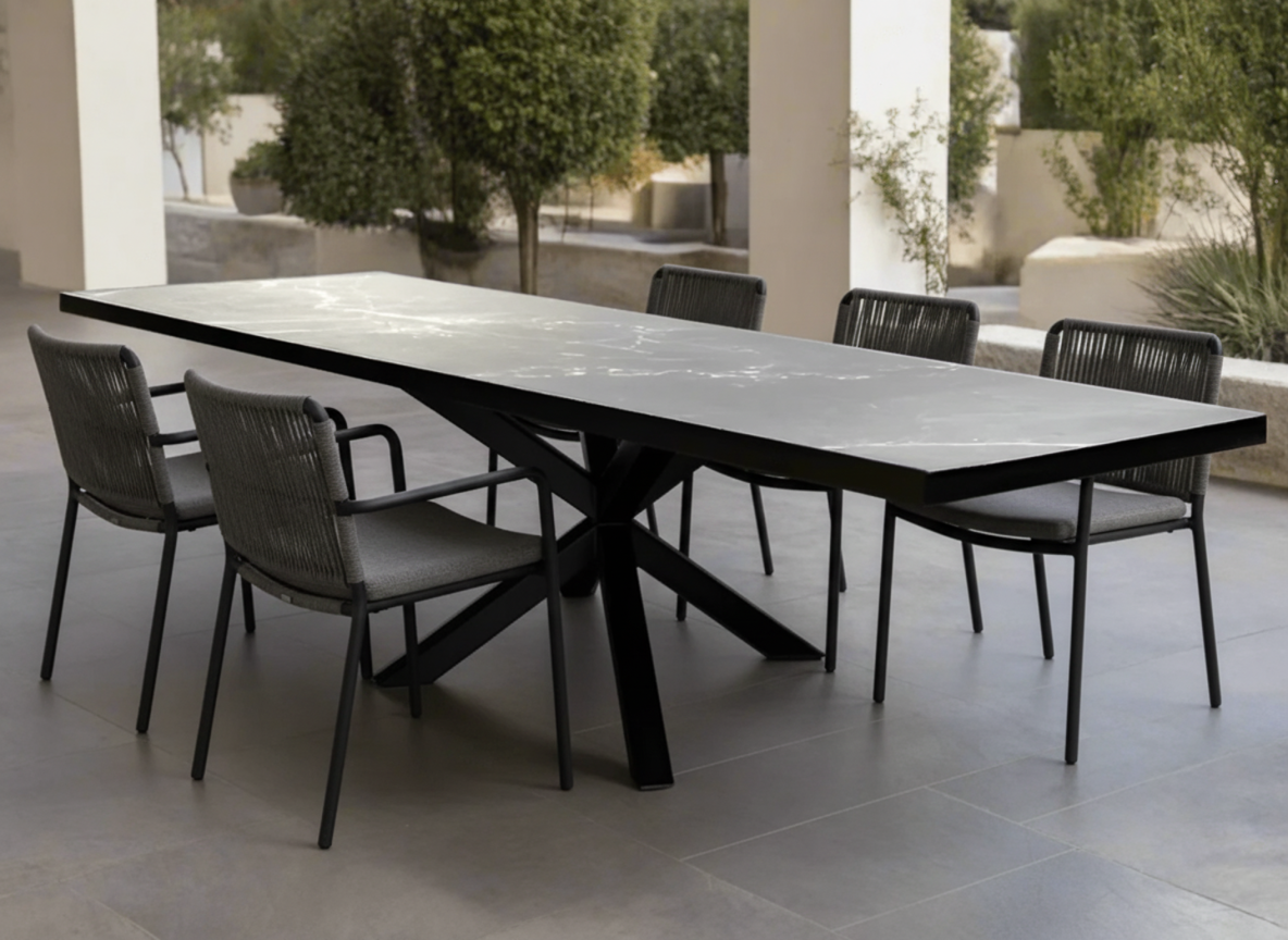 Discover the ultimate in outdoor dining luxury with our maintenance-free exterior dining tables, crafted using robust box steel and topped with premium Italian porcelain. This table is built for durability and elegance, standing strong against the elements for a lifetime of use.